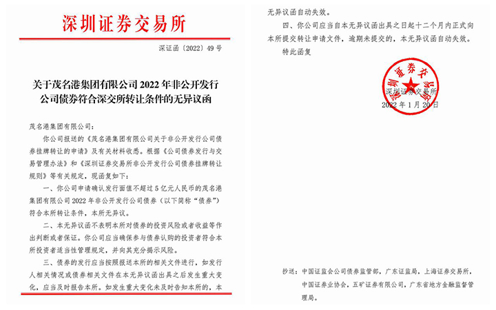 1月21日,茂名港集團公司成功獲得深交所5億元公司債無異議函。獲得無異議函之后,標志著我司已具備發(fā)行公司債的所有硬性條件。