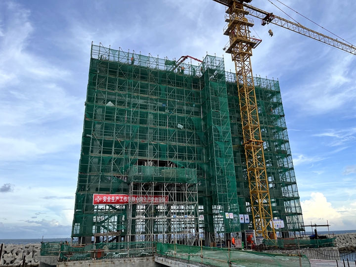 油品碼頭工程2#工作樓為鋼筋混凝土框架結(jié)構(gòu),基礎(chǔ)為澆筑完成的水工平臺,占地面積383.46平方,建筑面積1533.84平方,總高度23.28米,層數(shù)為地上4層,最大層高為7.15米。油品碼頭項目負(fù)責(zé)人表示,2#工作樓屬于高支模、大跨度、大荷載模板工程,施工難度大;加之臨水臨邊作業(yè),材料運輸、混凝土澆筑施工存在困難。