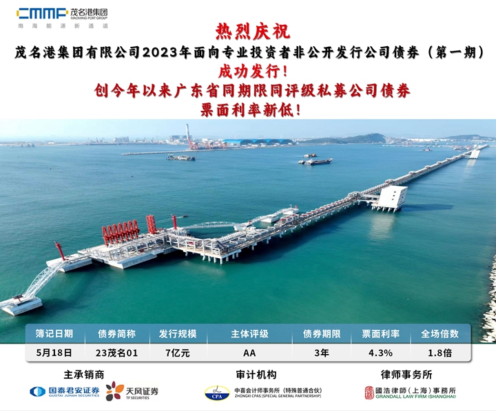 熱烈慶祝茂名港集團(tuán)有限公司2023年面向?qū)I(yè)投資者非公開(kāi)發(fā)行公司債券(第一期)成功發(fā)行!