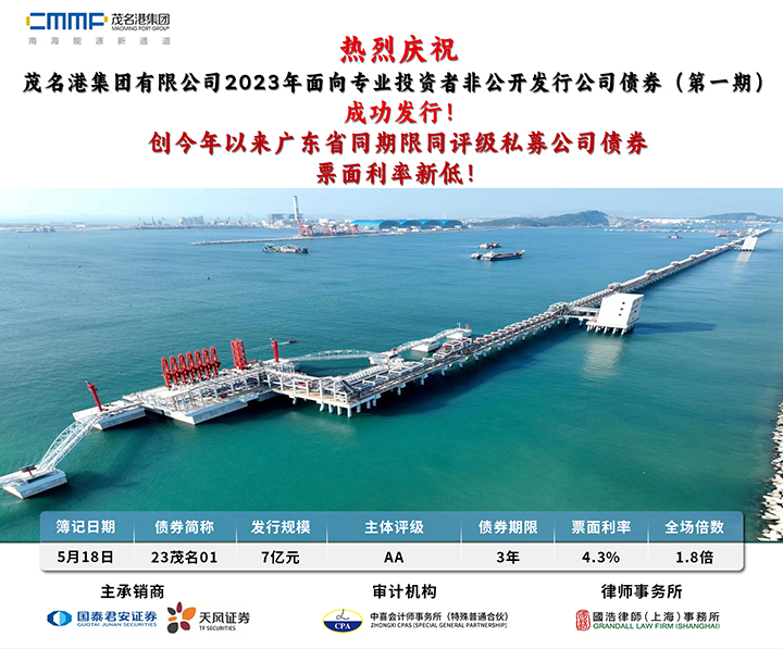 5月18日,茂名港集團(tuán)2023年非公開發(fā)行公司債券成功發(fā)行,募集規(guī)模7億元,期限為3年,票面利率4.3%,創(chuàng)下今年以來廣東省同期限同評(píng)級(jí)同品種票面利率新低,為集團(tuán)后續(xù)融資奠定了良好基礎(chǔ)。
