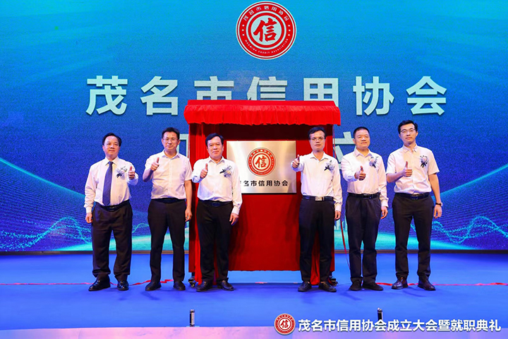 茂名市人大常委會(huì)副主任吳海強(qiáng)(右三),茂名市政協(xié)黨組副書(shū)記、副主席楊培基(左三),茂名市人民政府副秘書(shū)長(zhǎng)何江(右二),茂名市發(fā)展和改革局黨組書(shū)記、局長(zhǎng)朱春保(左二 ),廣東省發(fā)展改革委信用建設(shè)處一級(jí)主任科員譚強(qiáng)杰(右一),茂名市信用協(xié)會(huì)會(huì)長(zhǎng)李文(左一)共同為茂名市信用協(xié)會(huì)揭牌。