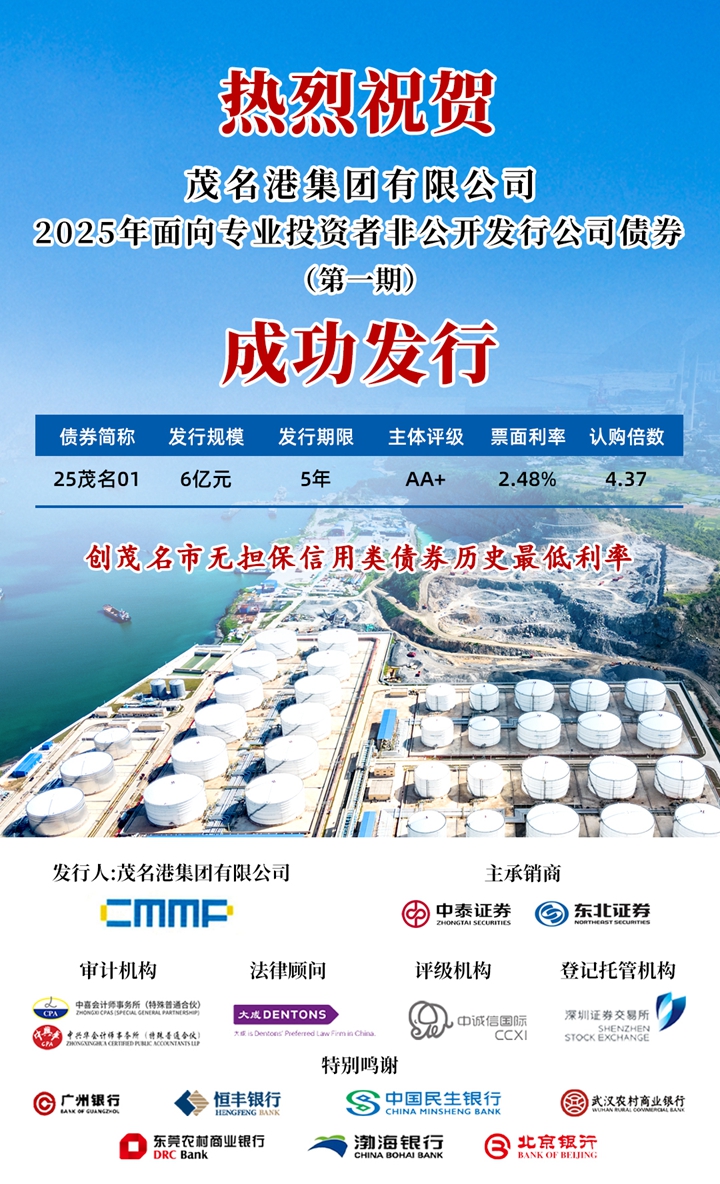 4月17日,茂名港集團(tuán)成功發(fā)行2025年度“25茂名01”公司債券。本期債券發(fā)行規(guī)模為6億元,債券期限為5年期,最終票面利率定格在2.48%,全場(chǎng)認(rèn)購(gòu)倍數(shù)4.37倍,本期債券由中泰證券股份有限公司擔(dān)任簿記管理人。