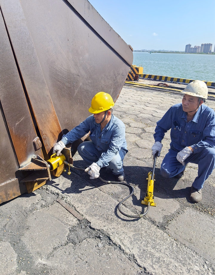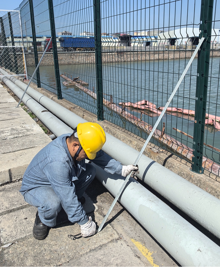 碼頭之間周界圍擋是安全管控的重要屏障,也是港口設施保安工作重要設施之一。按外委維修方案,需整體制作圍擋,費用約8萬元。 “能不能自己干?!”黨員維修組現(xiàn)場測量圍擋尺寸,設計“鋼管立柱+鋼絲網(wǎng)格+防撞條”的簡易圍擋方案,反復論證可行性后,決定擼起袖子自己干!為確保穩(wěn)固性,黨員維修組用水平儀一米一米測標高,用扳手一顆一顆緊螺栓;為防臺風天氣傾倒,把鋼管底部焊接在混凝土基座,用水平尺校準“毫米級”垂直度。5天的連續(xù)作業(yè),為港口經(jīng)營公司周界圍擋起整齊牢固的“安全防線”。